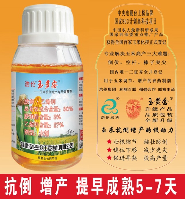 玉多安是由中國農(nóng)業(yè)大學(xué)作物化控中心和浩倫農(nóng)業(yè)科技集團(tuán)針對(duì)玉米生產(chǎn)多年來存在的倒伏、禿尖、空桿等問題,聯(lián)合研究開發(fā)的一種玉米專用調(diào)節(jié)劑。