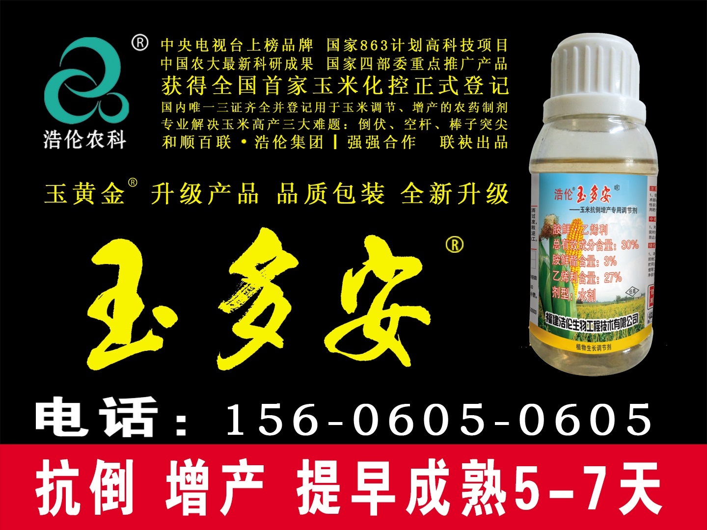 玉多安是由中國農(nóng)業(yè)大學(xué)作物化控中心和浩倫農(nóng)業(yè)科技集團(tuán)針對(duì)玉米生產(chǎn)多年來存在的倒伏、禿尖、空桿等問題,聯(lián)合研究開發(fā)的一種玉米專用調(diào)節(jié)劑。